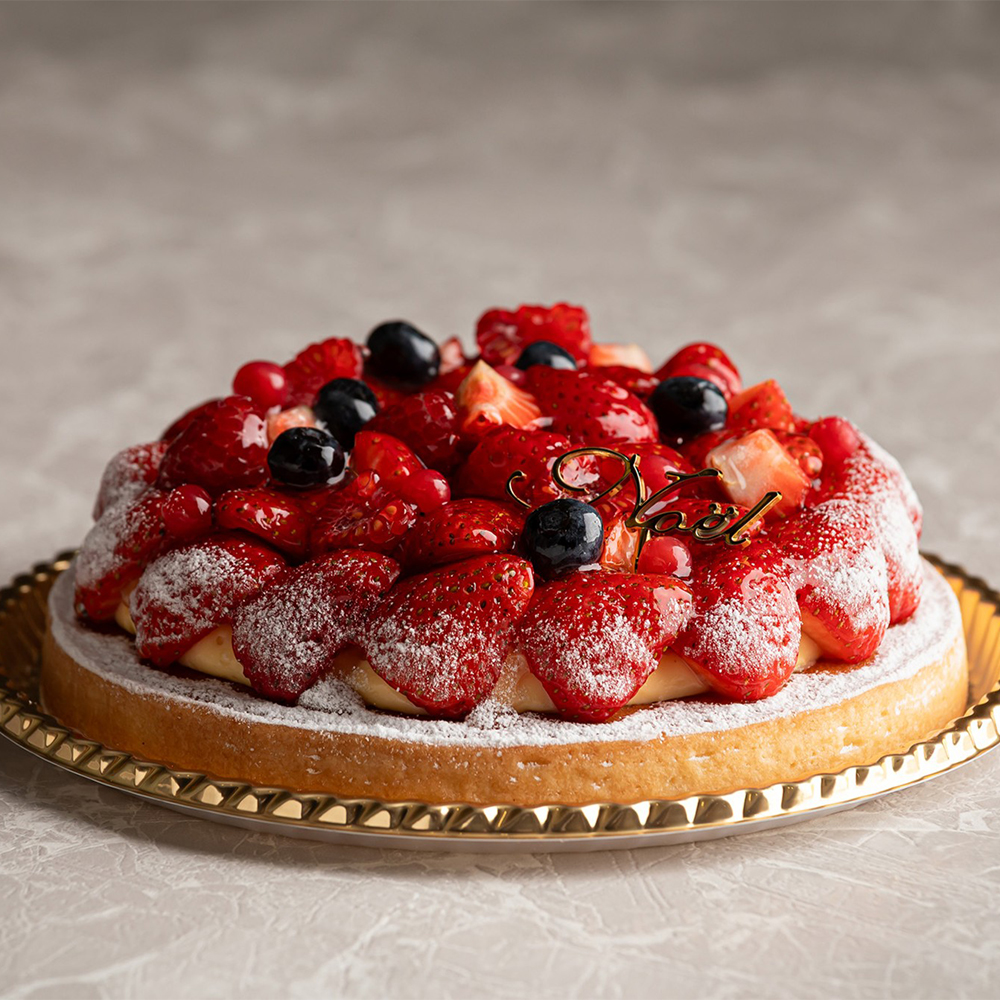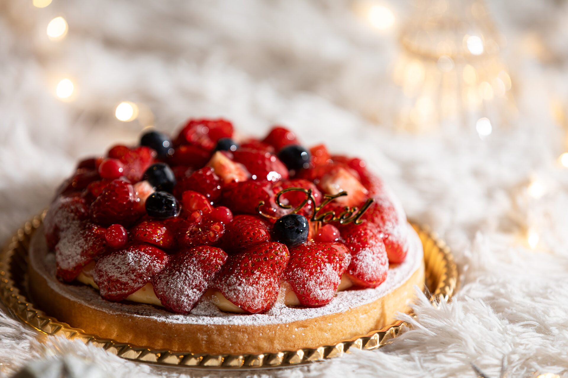 コクのあるカスタードクリームとアーモンドの香りがたまらないタルト生地に、たっぷりのいちごとベリーを盛り付けた贅沢なクリスマスケーキです。