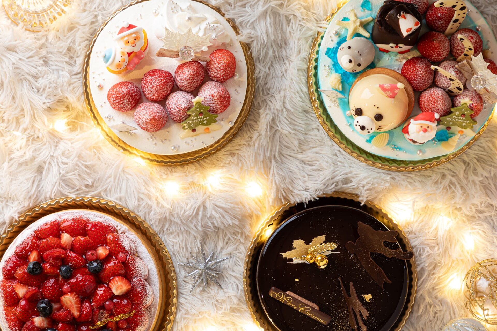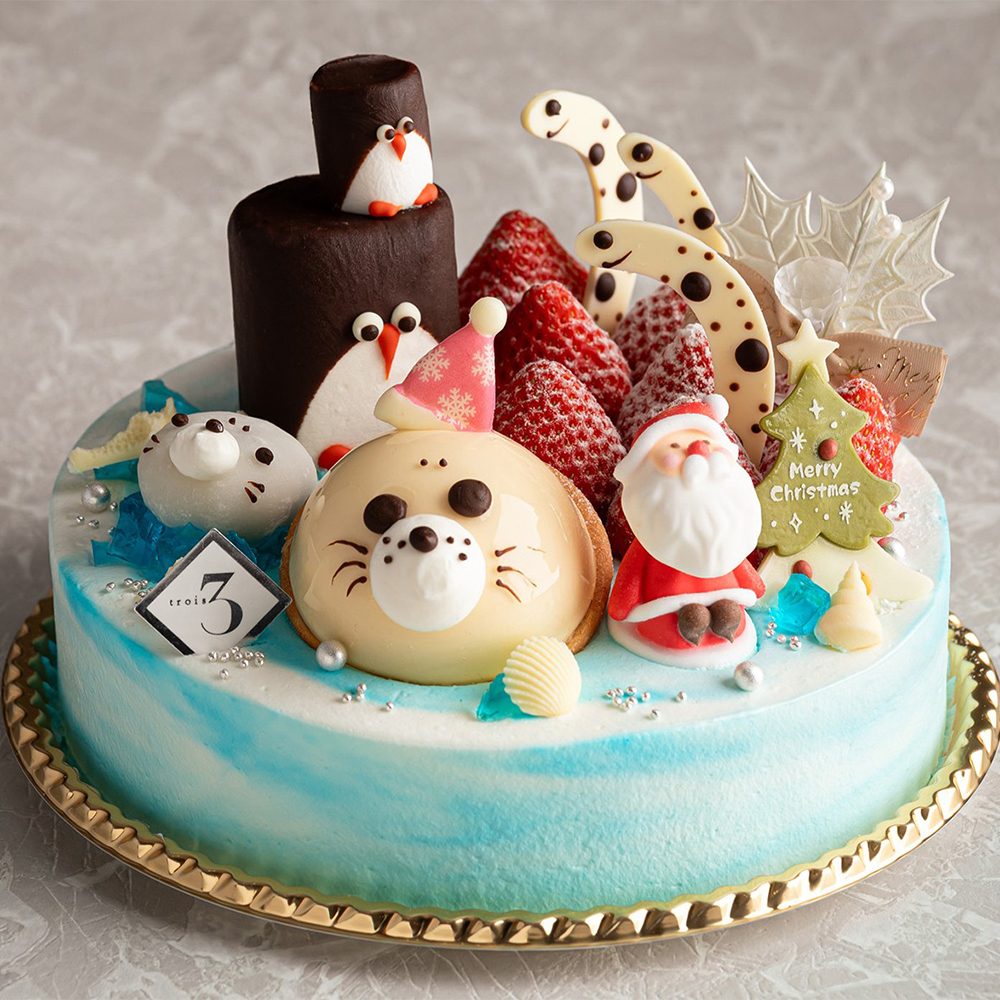 マリンブルーに輝く生クリームの上で、愛らしい親子アザラシやペンギン、チンアナゴなど水族館の仲間たちをモチーフにした海の中のクリスマスを表現。