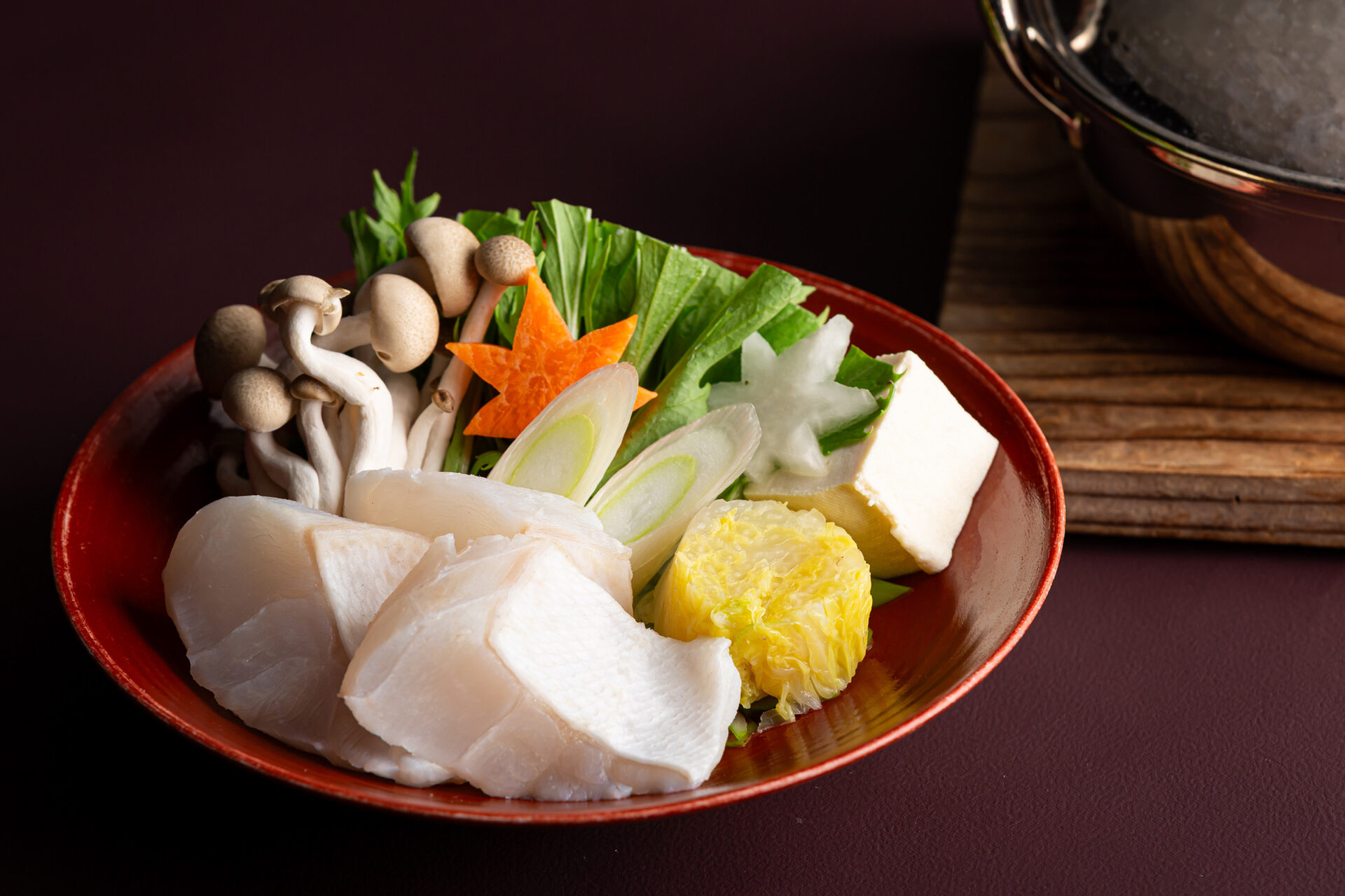 旬菜(烏賊明太子和え《福岡》、馬刺し葱巻《熊本》、りゅうきゅう《大分》、呉豆腐《佐賀》)/お造り(河豚葱巻《福岡》、烏賊刺し、関あじ《大分》、姫さざえ《佐賀》)/吸物(11月:関あじつみれ、12月:博多蒸し雑煮)/煮物(博多蕪蒸し、甘鯛、占地、銀杏、紅葉麸、公孫樹南瓜)