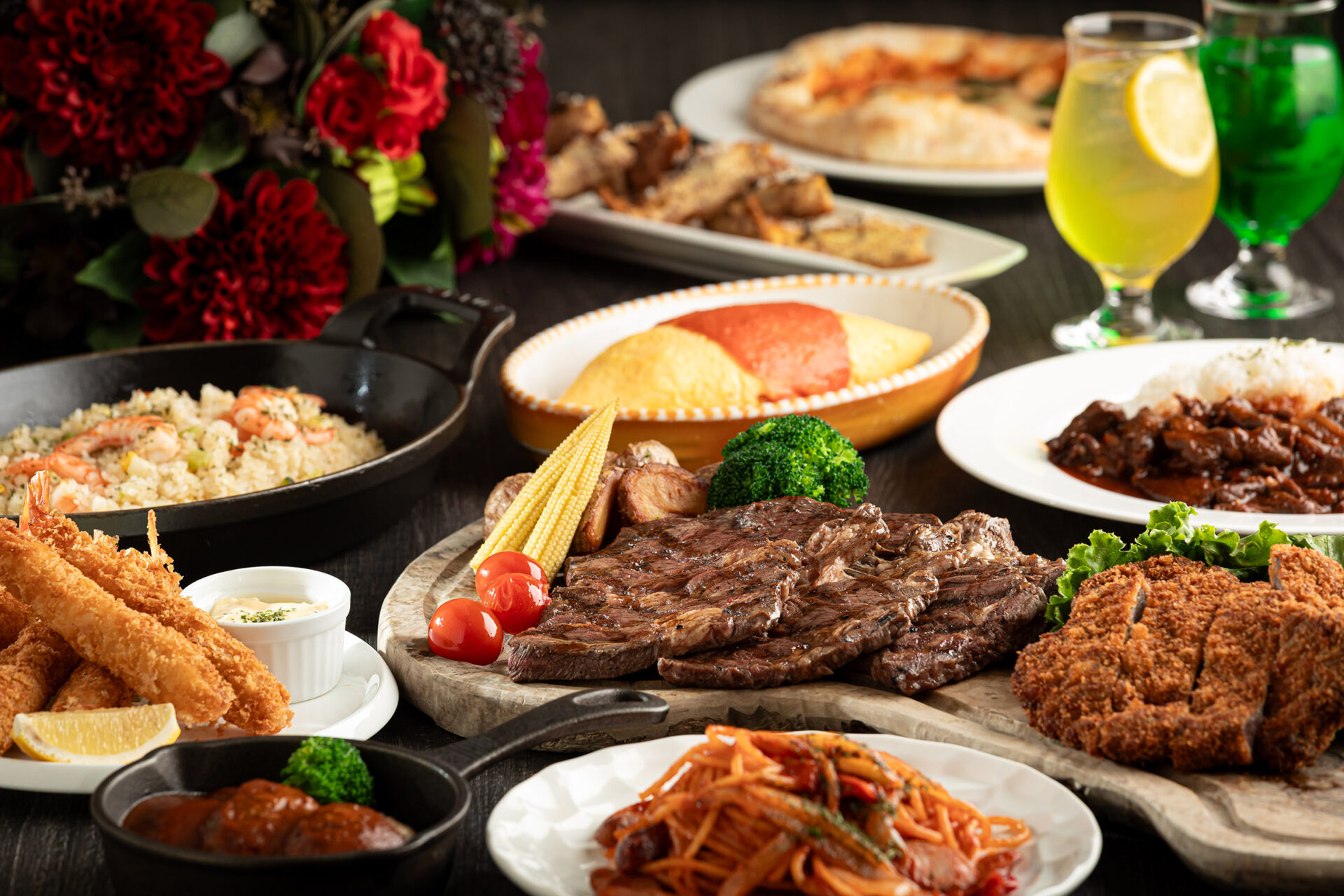 鉄板焼きビーフステーキ シャリアピンソース、ハヤシライス、ビーフカツレツ、ホテル特製カレー、エビフライ、エビピラフ、オニオンスープ、スパゲッティナポリタン、旬魚のソテー、シーフードサラダ 明太ドレッシング、デミグラスハンバーグ、本日のパスタ、ピザ2種、本日のデザート