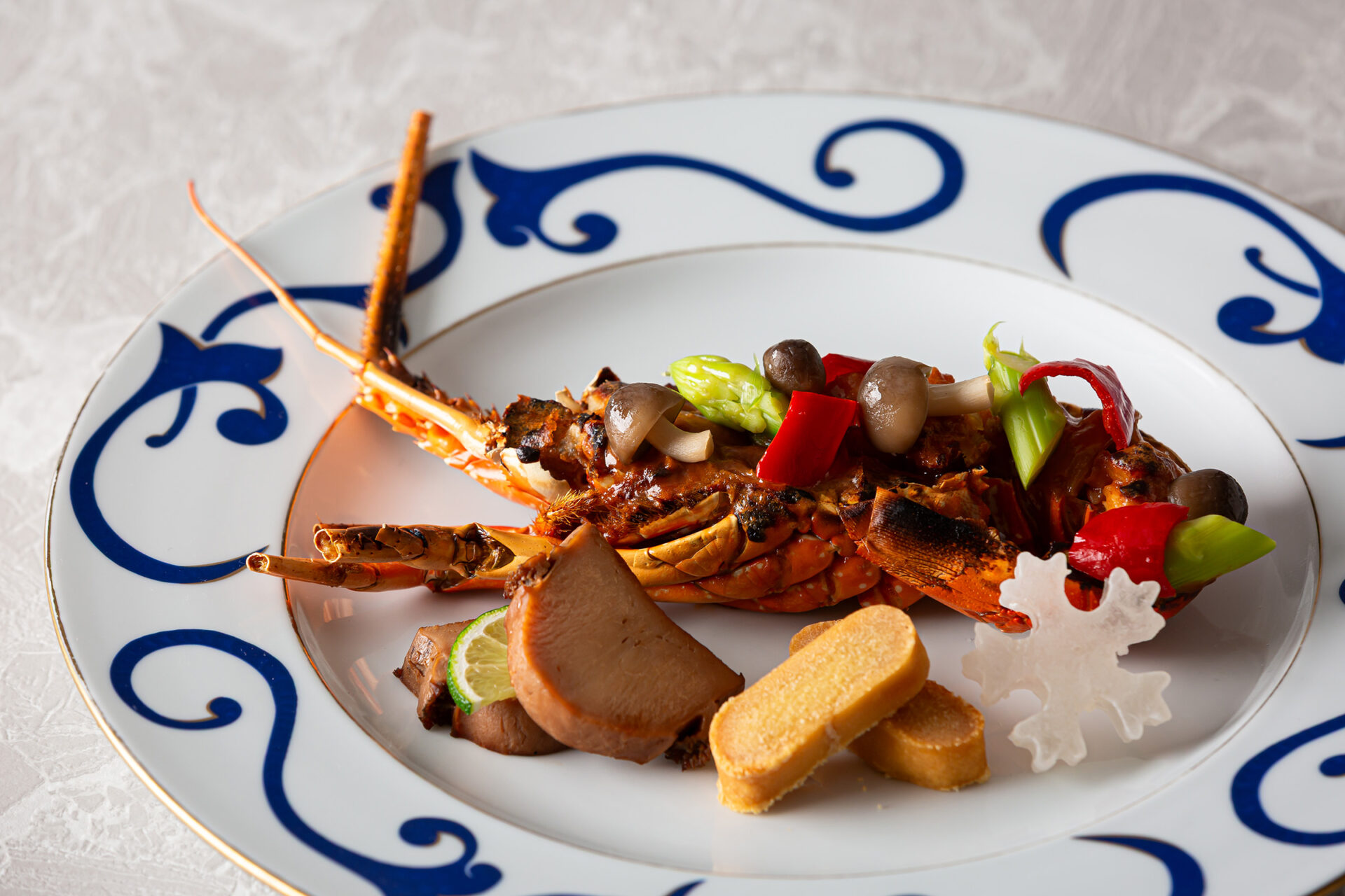 ・焼物 伊勢海老鬼殻焼き 海老味噌ソース、鮑牛酪焼き 炙り唐墨 立花琥珀糖