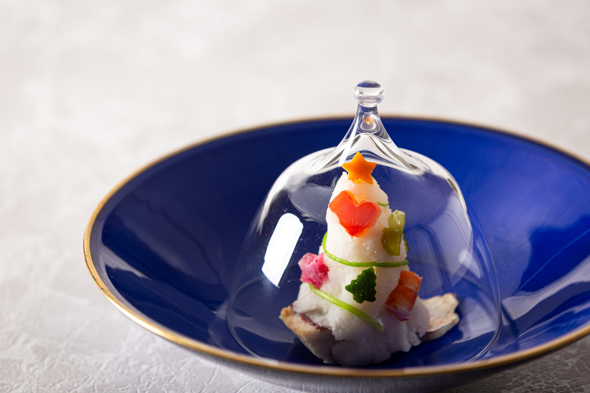 ・蒸し物 ツリー仕立て甘鯛かぶら蒸し 彩り野菜 揚げあられ餅 山葵餡