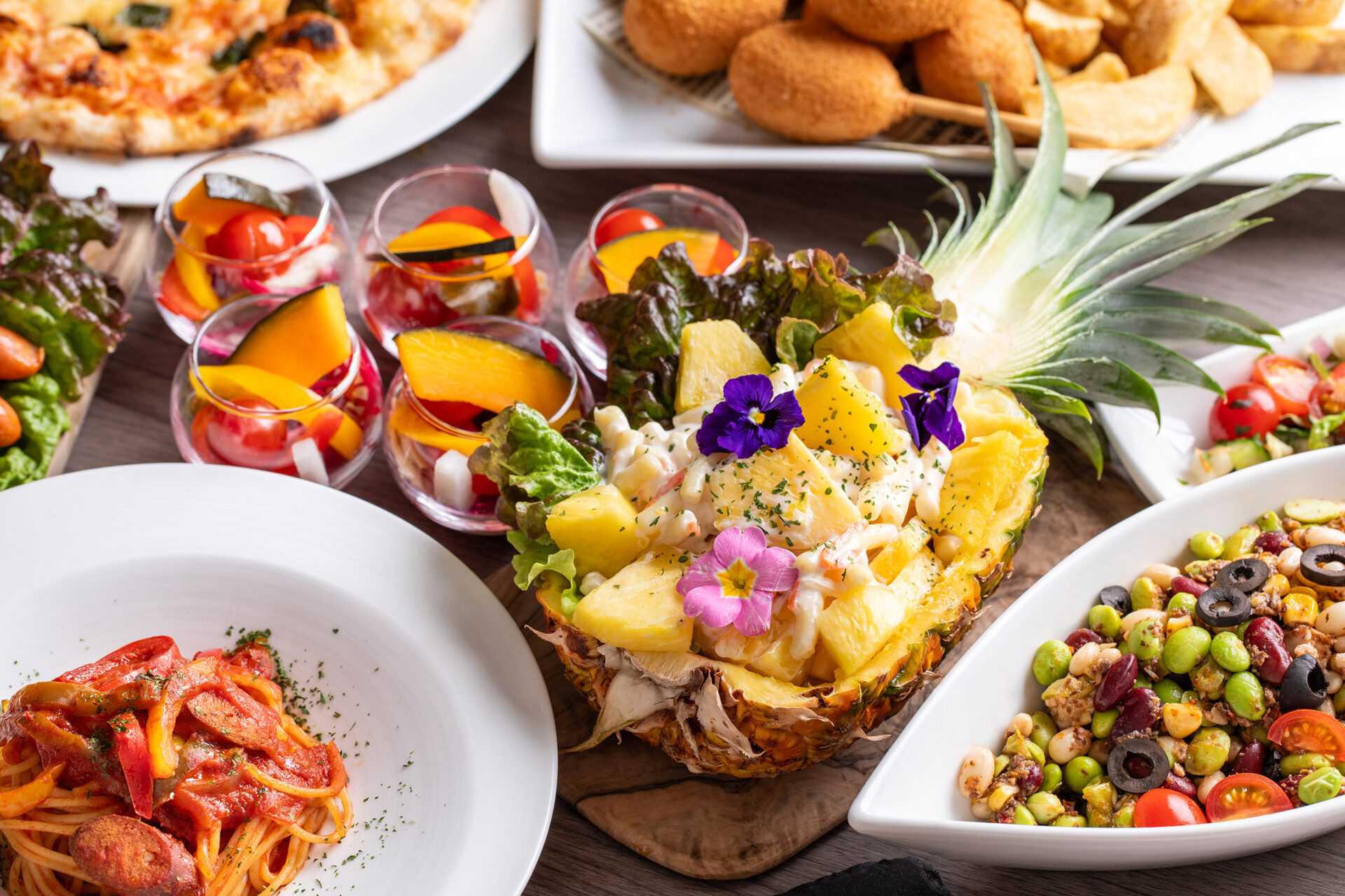 鉄板焼きビーフステーキ / 熊本産トマトとバジルのサラダ / 有明産クラゲのサラダ / 大阿蘇鶏ポテトサラダ / 大阿蘇鶏のトマト煮込み / 熊本産玉葱のローストデコポンのソース / 空豆とショートパスタ大阿蘇牛乳のホワイトソースグラタン / 本日のパスタ・ピザ / 本日のデザート / チョコレートファウンテン