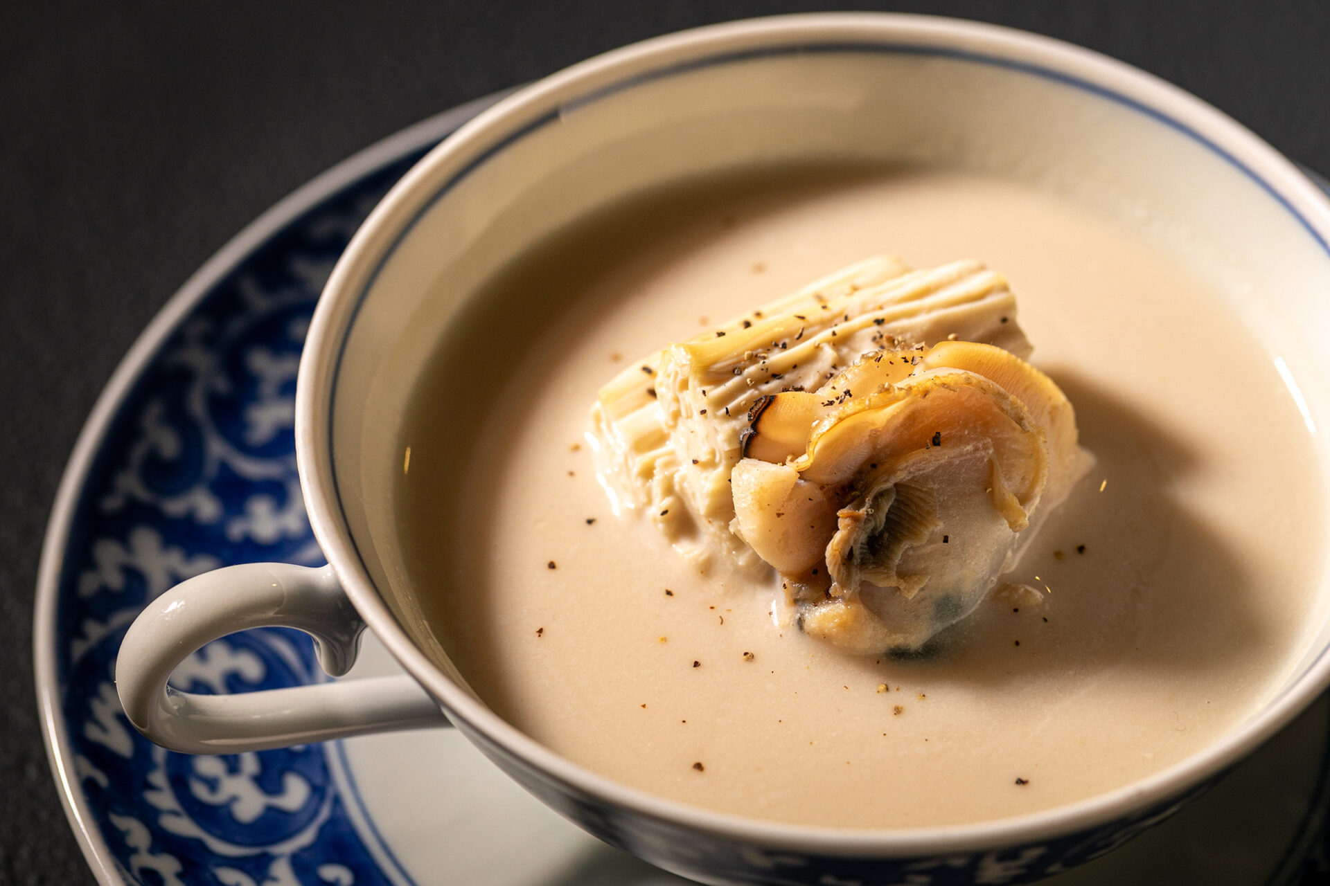 吸物(蛤入り豆乳スープ 黒胡椒 刺身湯葉)