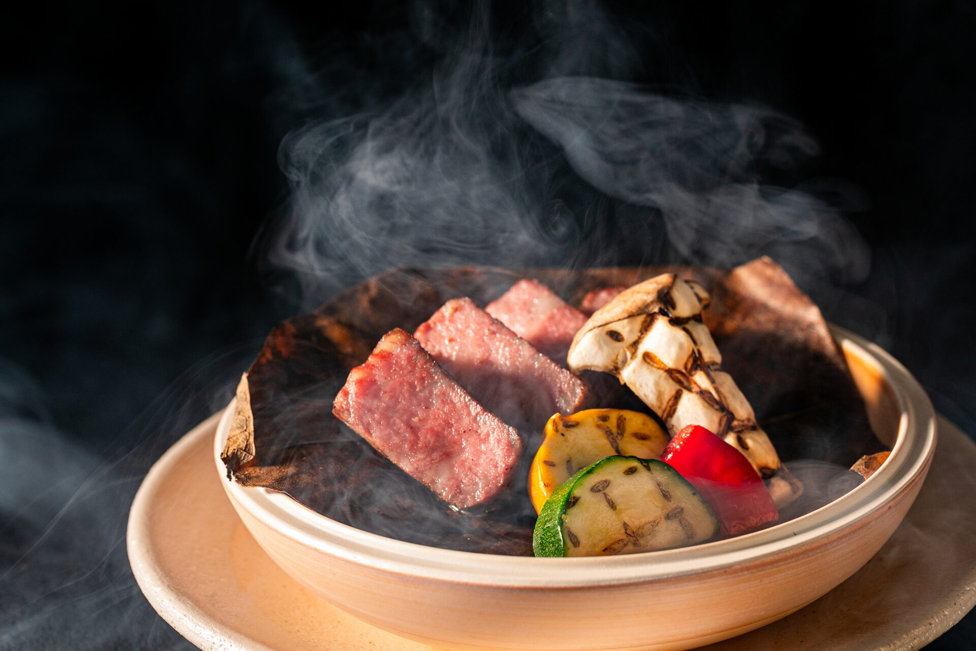 強肴(黒毛和牛ステーキ 焼野菜 筑紫野特製抹茶ソース 肉だれ 山葵