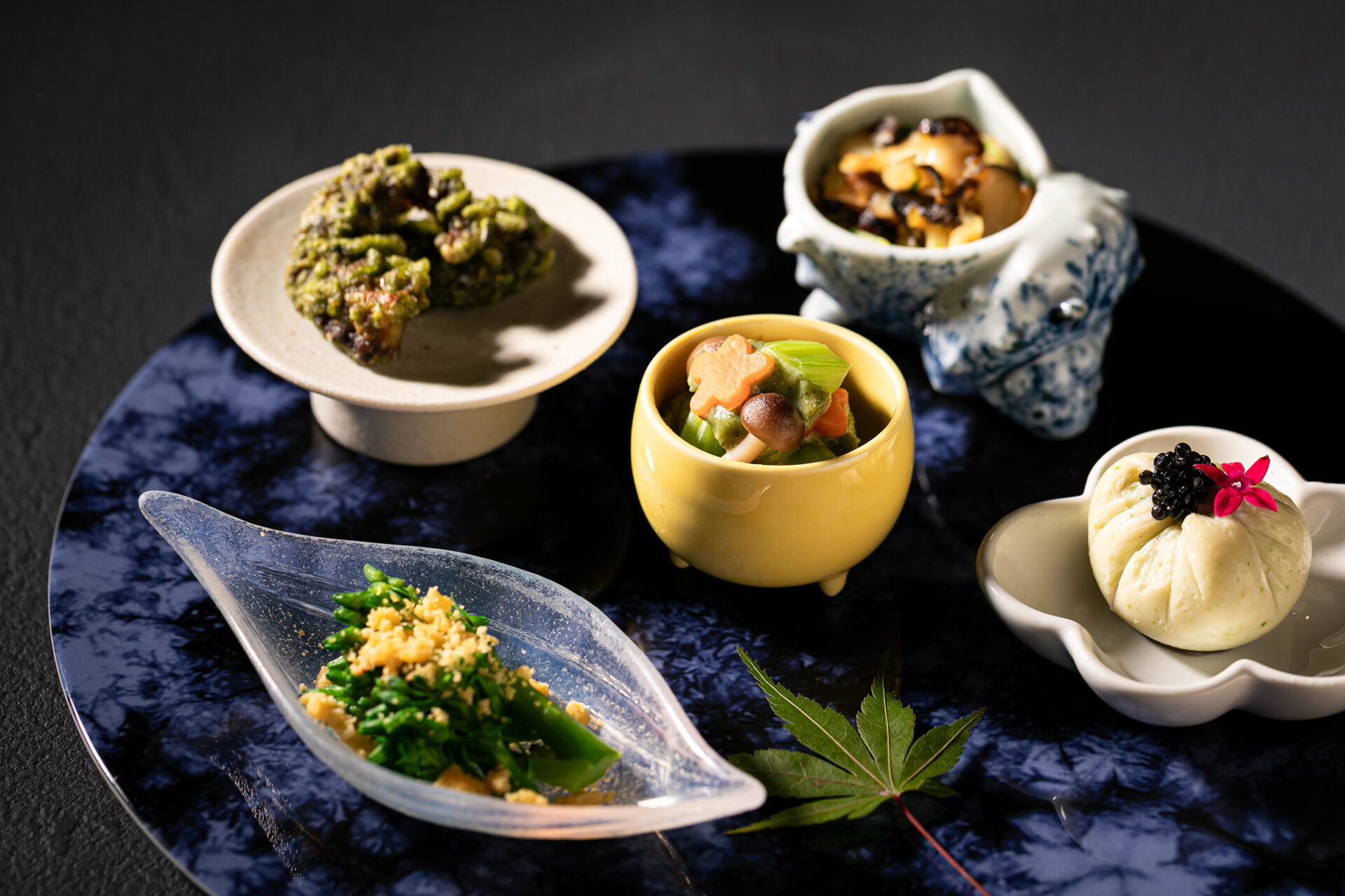 旬菜(春キャベツ豆腐 キャビア、木の芽和え、菜の花昆布〆炙り唐墨、水菜と栄螺牛酪炒め、蛸抹茶揚げ)