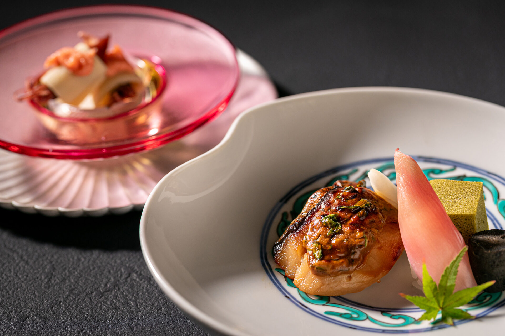 焼物(鰆 蕗味噌焼き 抹茶浮島 蕪甘酢漬 花茗荷寿司)