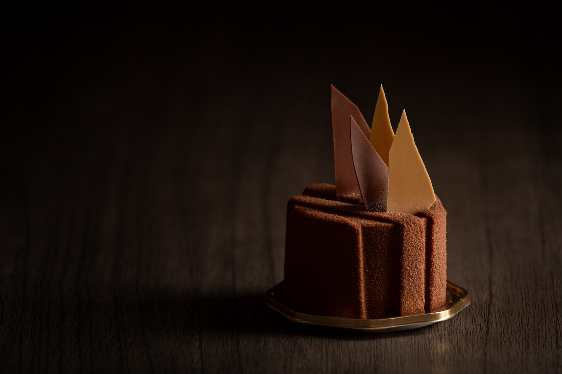 なめらかなショコラムースに、柚子のブリュレと濃厚なハイカカオのガナッシュを重ね合わせました。フランス・ヴァローナ社のミルクショコラとハイカカオショコラの2種を贅沢に使用、柚子の爽やかな風味とショコラの絶妙なハーモニーが広がります。